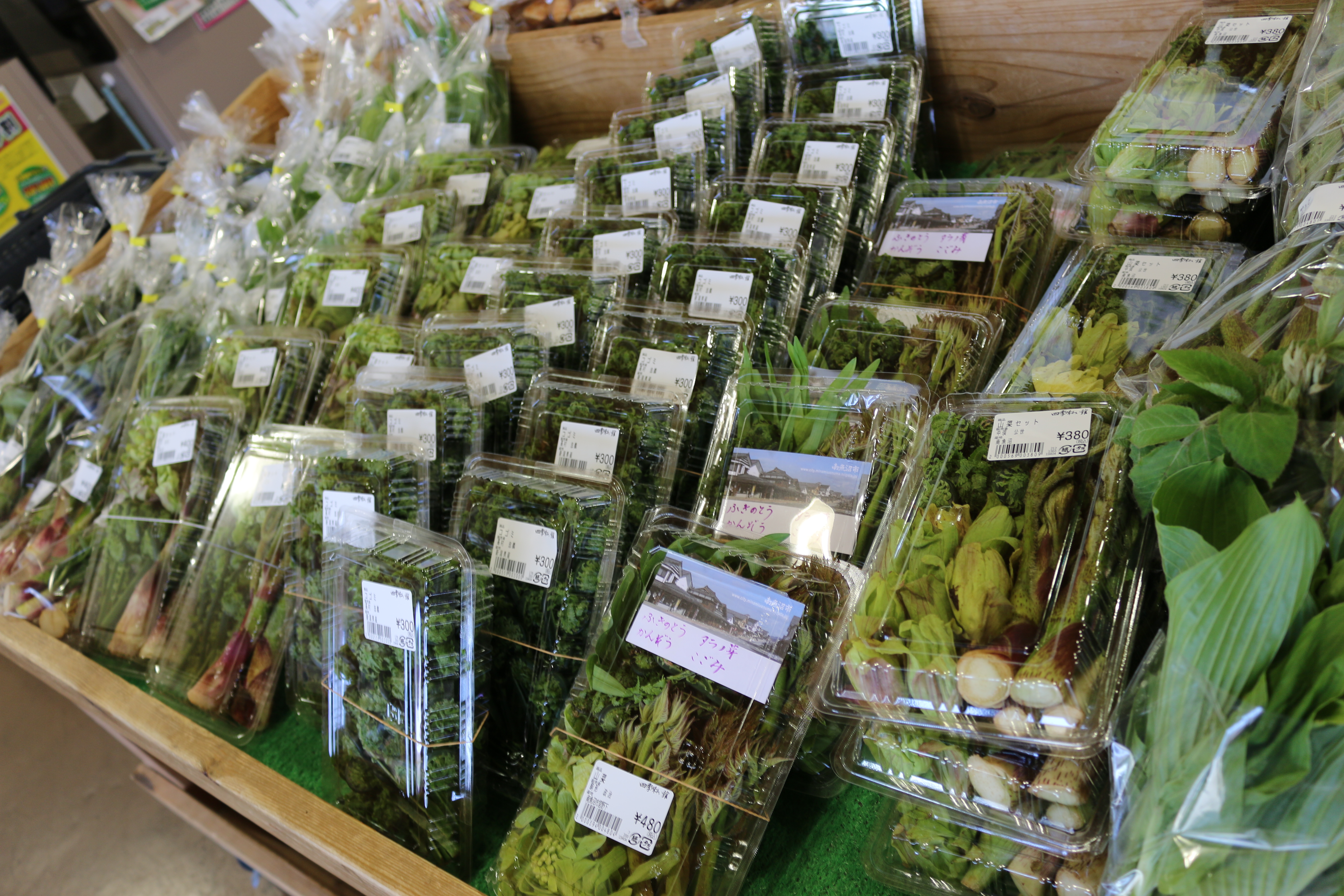 山ウド、キノメ、ふきのとう、カンゾウ、あさづき、コゴミ、ウルイ、雪下ニンジン、雪室野菜取り揃えています。