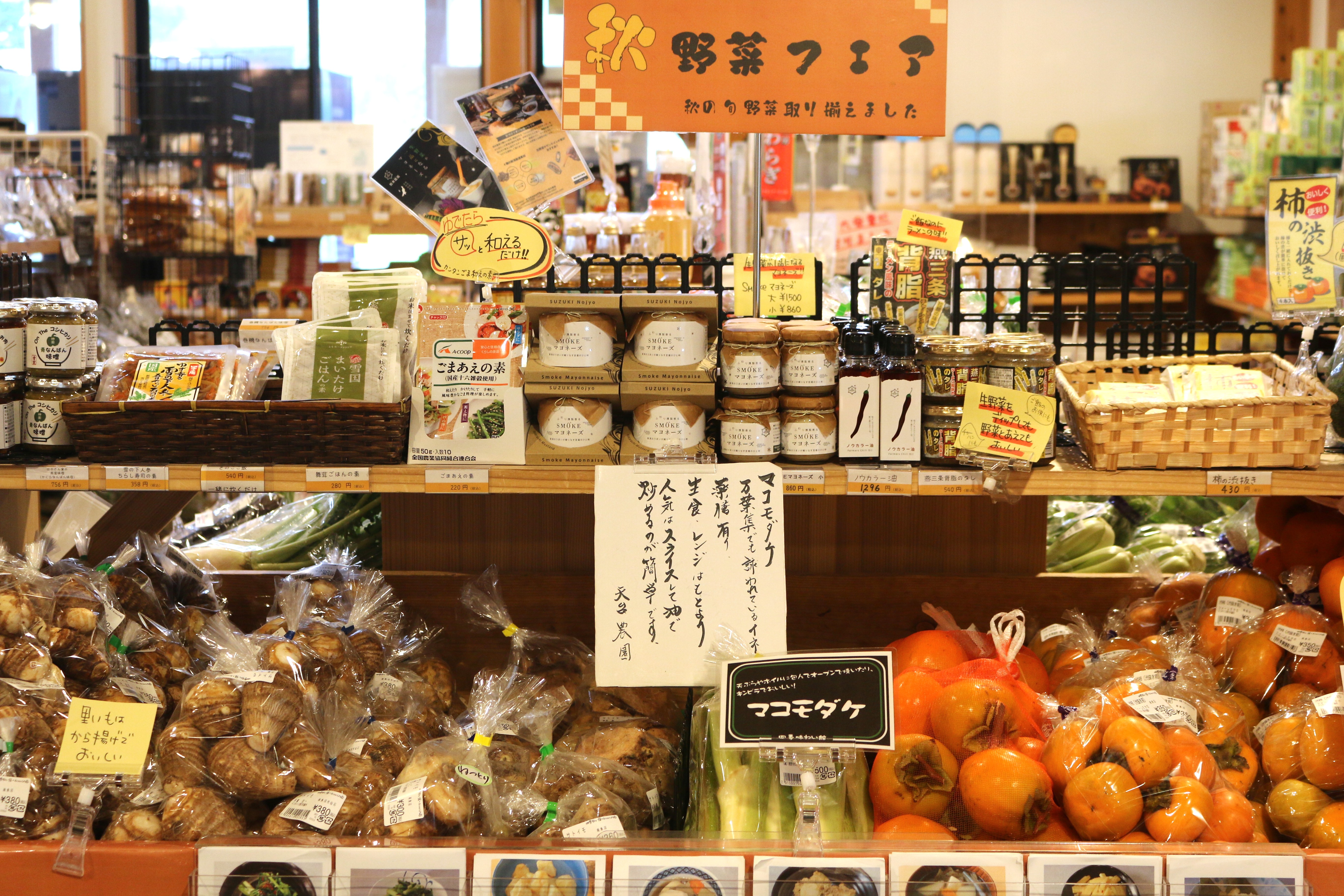 四季味わい館からのお知らせです。本日の入荷は、大根、里芋、キャベツ、かぶ、なす、神楽南蛮、ししとう、甘なんばん、人参、長ねぎ、ずいき、枝豆、新生姜、アスパラ菜、春菊、小松菜、野沢菜、味美菜、菊芋、みょうが、しいたけ、なめこ、ぶなしめじ、りんご、渋柿、等々です。りんごは、群馬名月など晩成品種も出始めました!温かい物が美味しい季節になってきました。四季あじわい館で新鮮な野菜を買い求め、お鍋などいかがですか?ご来店お待ちしております(^▽^)/
