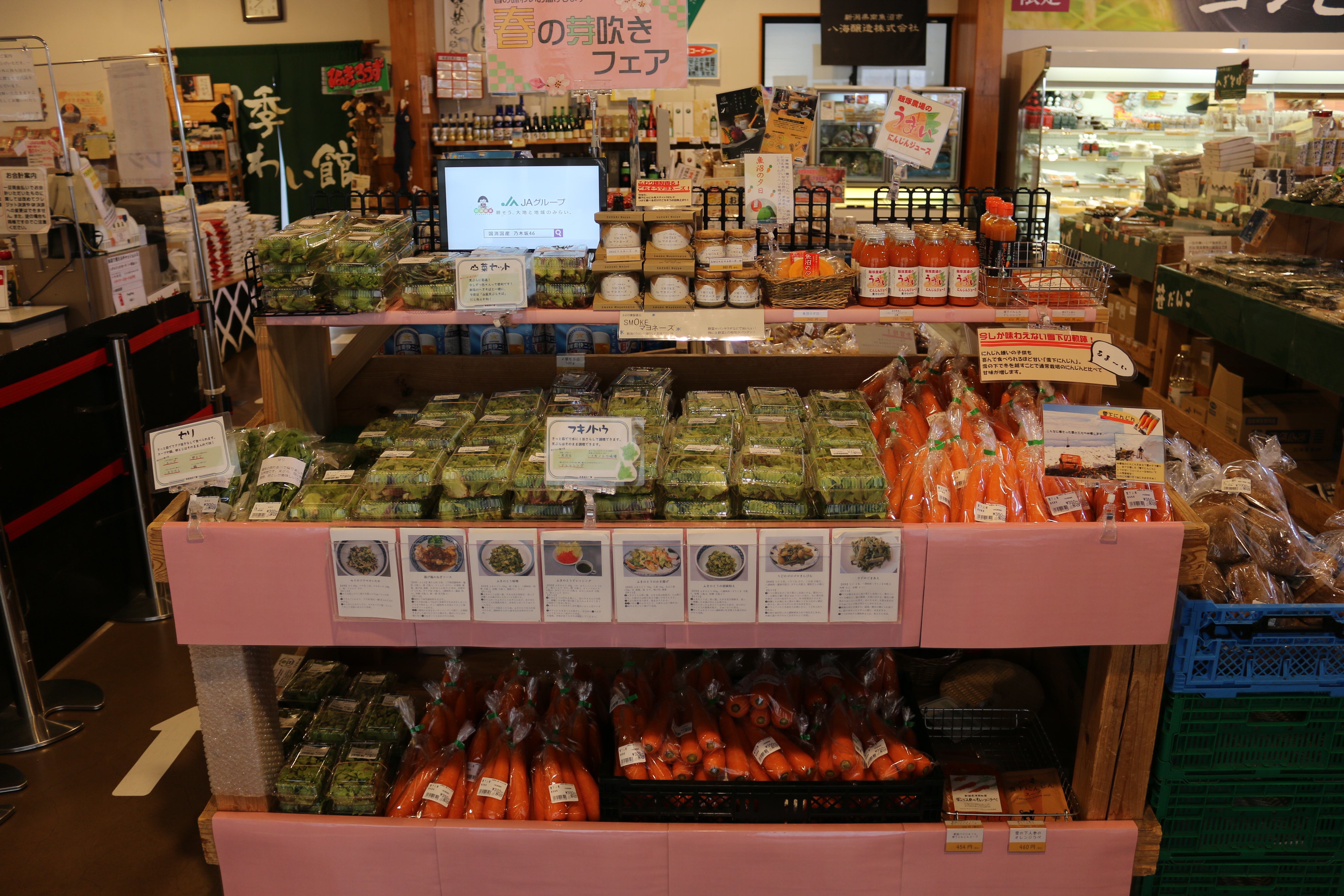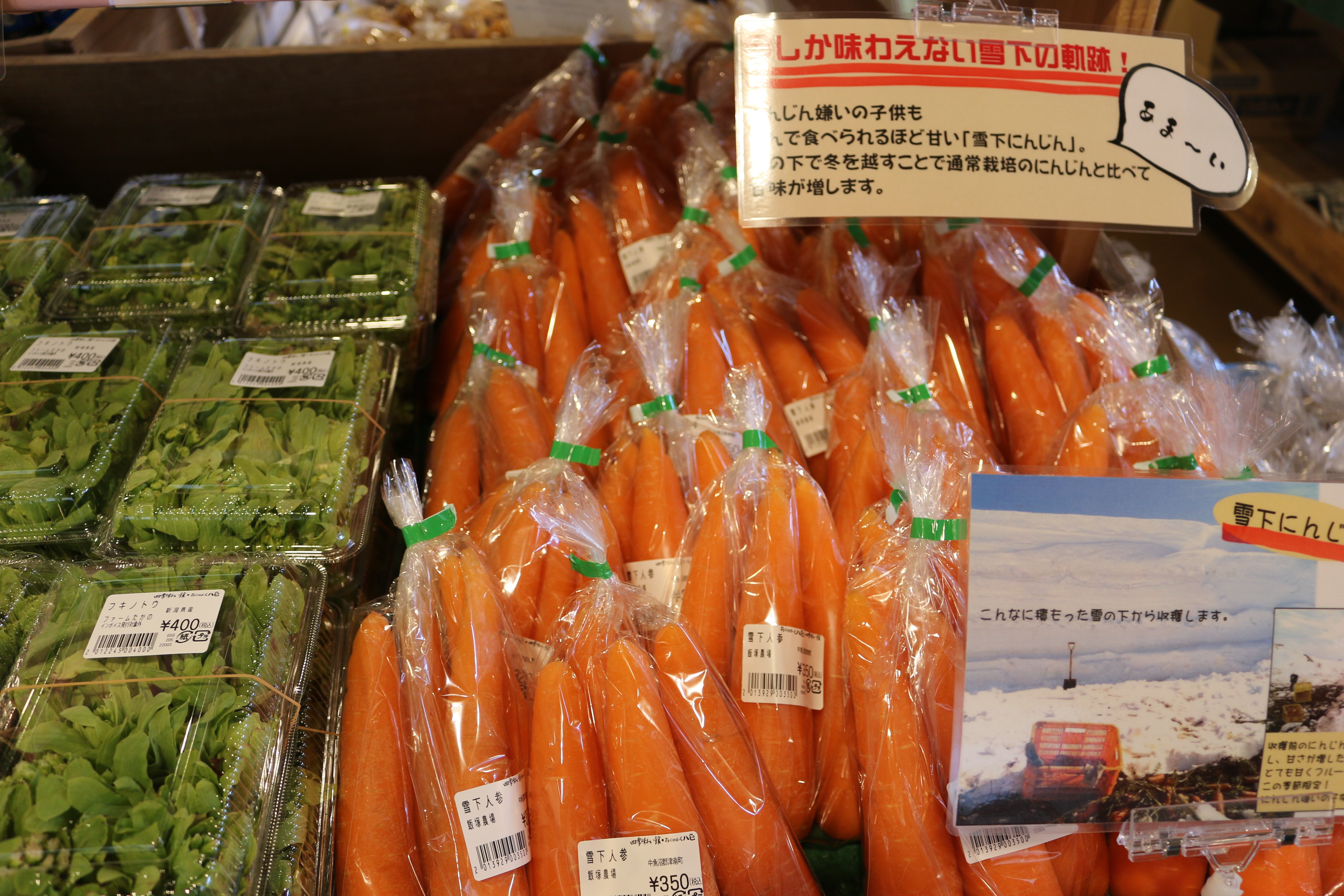 四季味わい館からのお知らせです♪本日はふきのとう・ウド・セリ・雪下人参・雪室人参・雪室ごぼう・青菜・大崎菜・ほうれん草・越冬キャベツ・越冬白菜・大崎菜・サラダほうれん草・なめこ・椎茸・しめじ・おかこもち・草餅・おはぎ・鶏卵等入荷しています(^O^)本日もお彼岸が続いております!どれも数に限りがありますのでお早めにご利用ください!