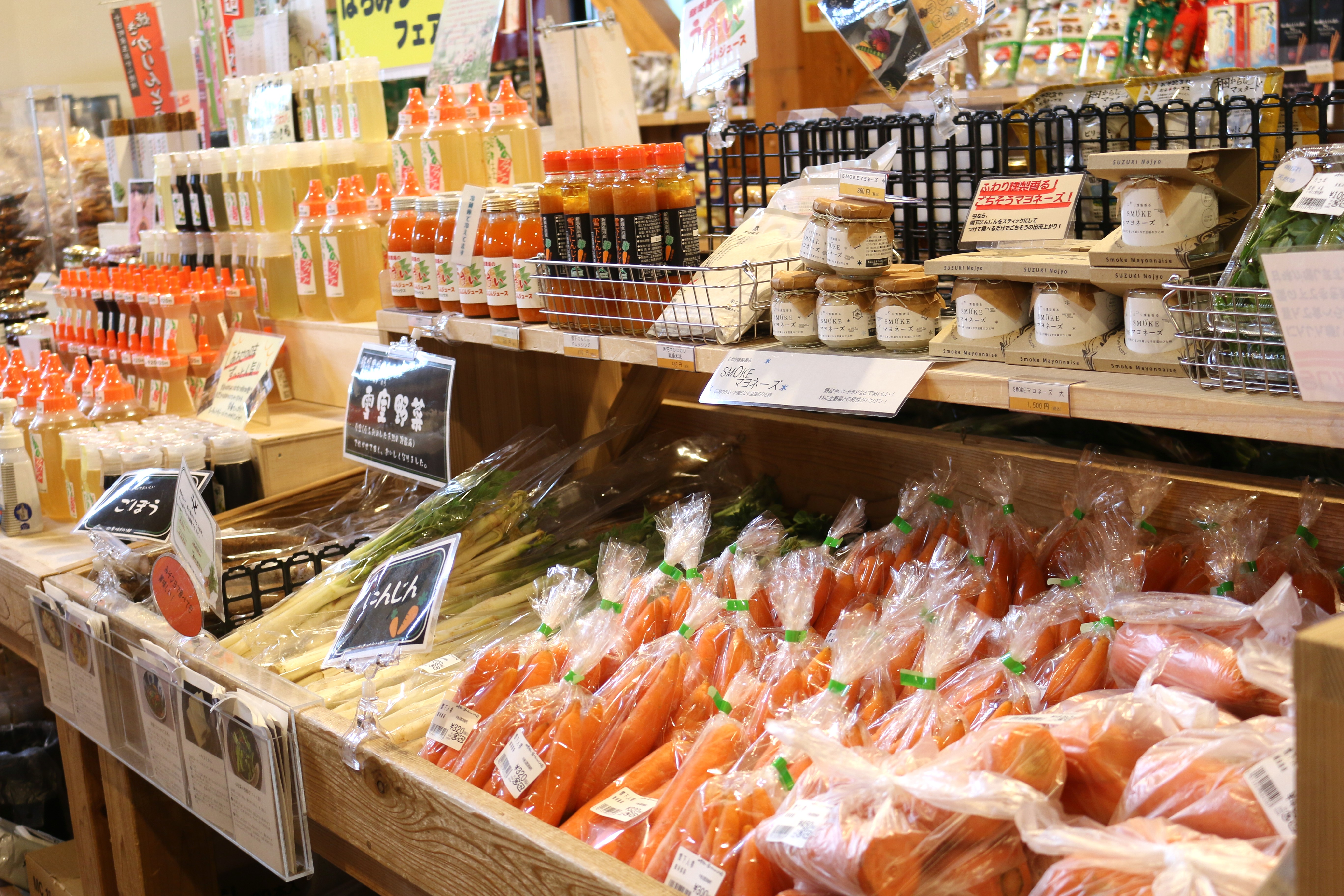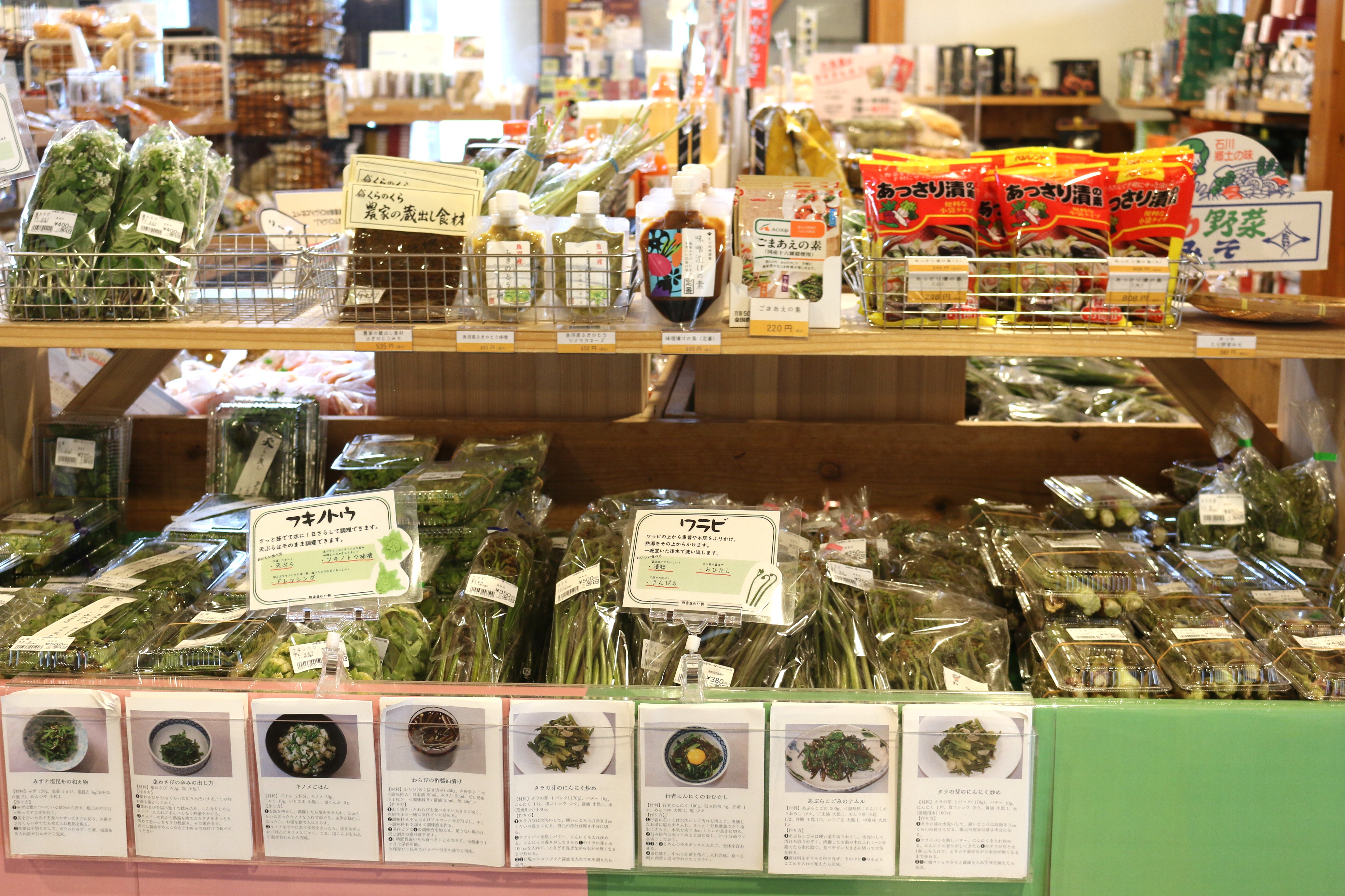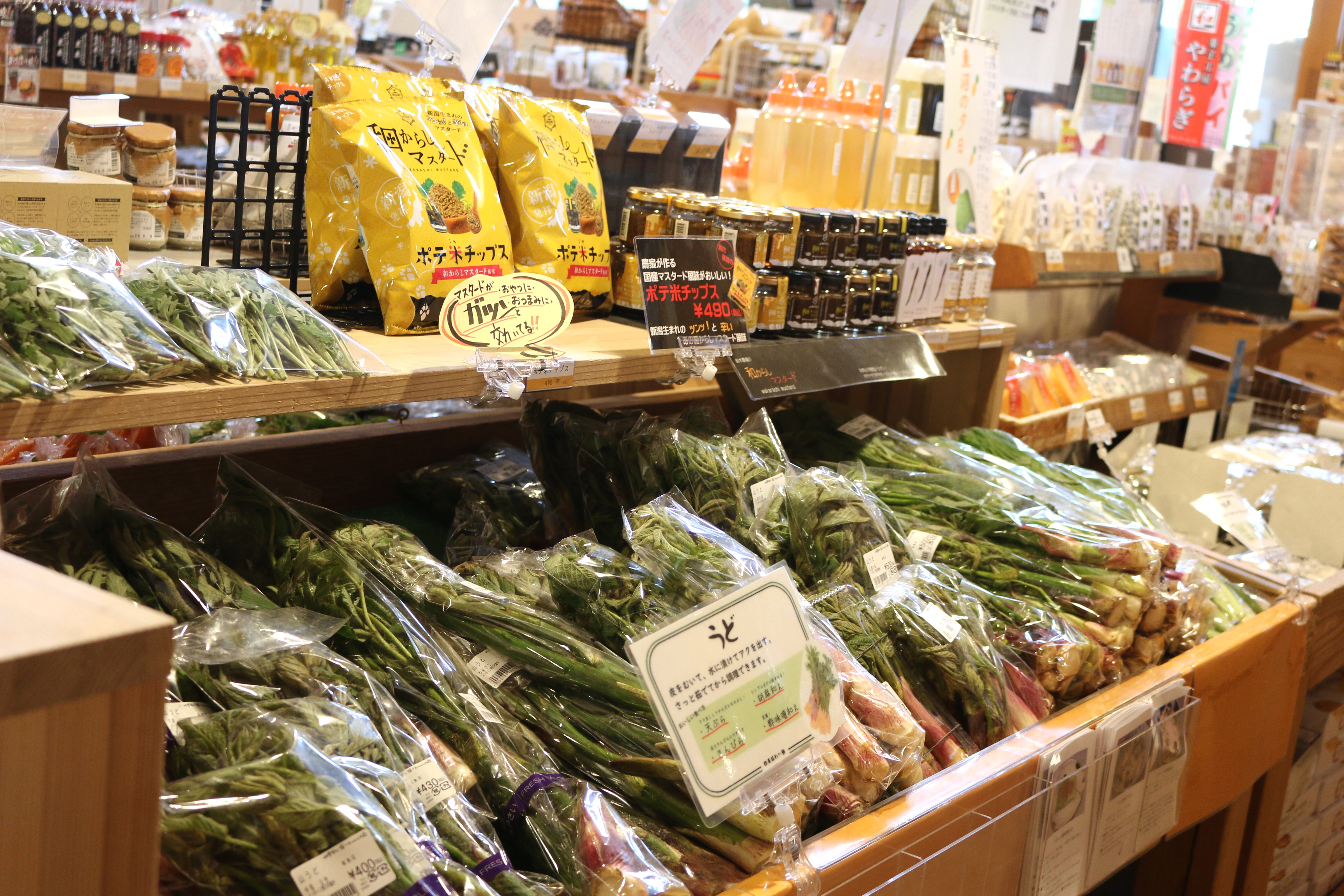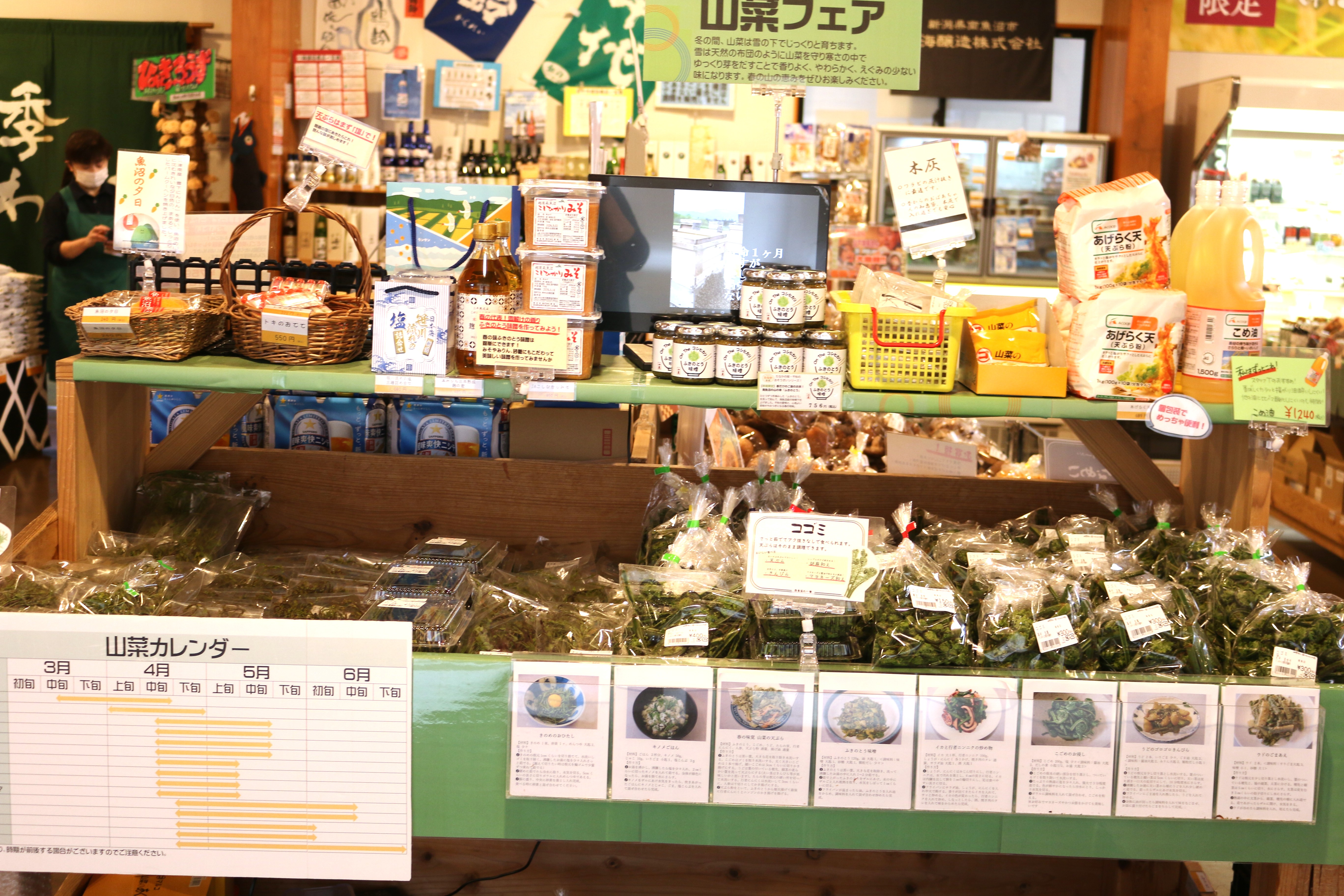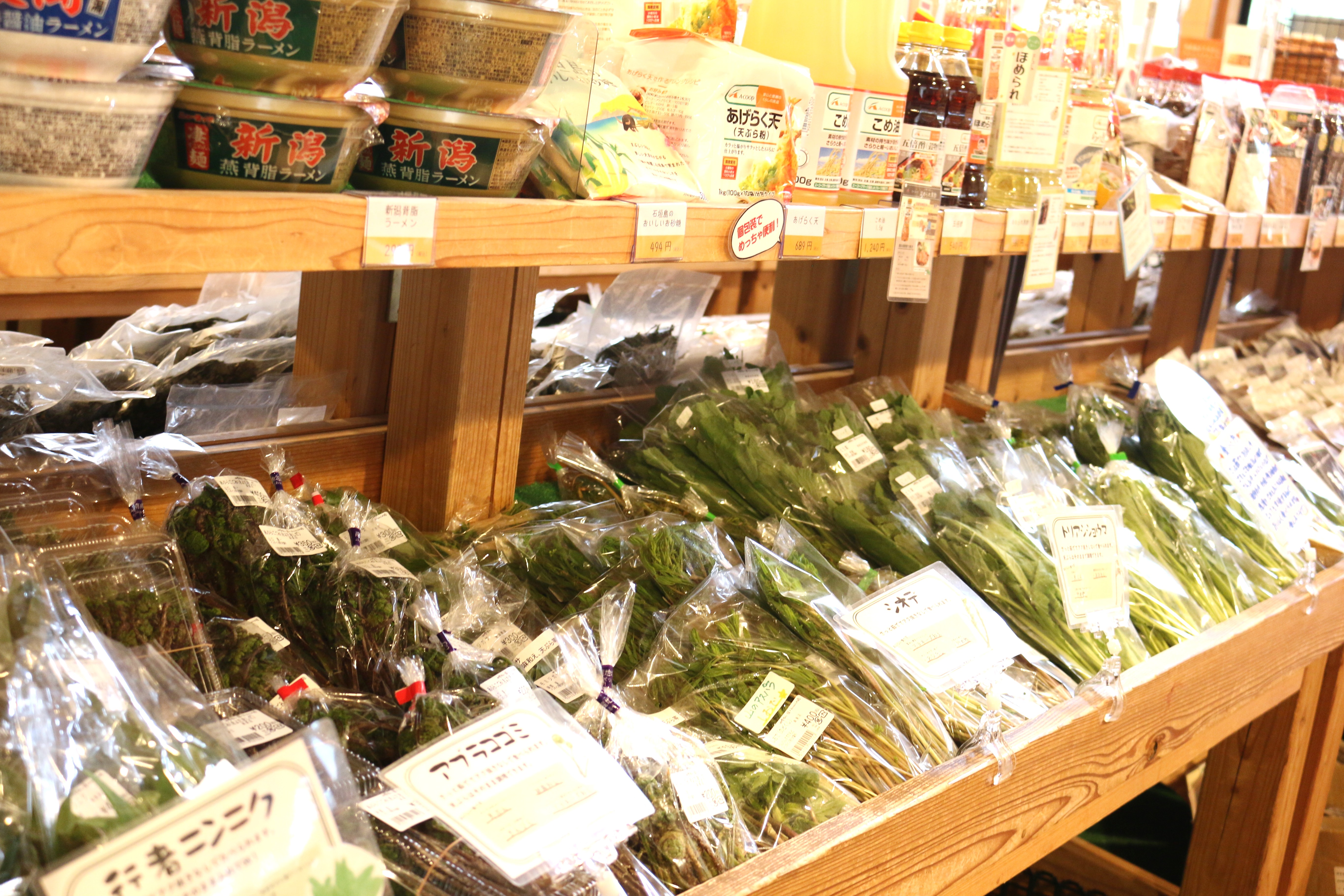 本日の入荷は、木の芽(あけびの新芽)、こごみ、あぶらこごみ、たらの芽、わらび、山うど、うるい、しおで、とりあししょうま、ふき、青菜、雪下にんじん、雪室ごぼう他、となっております。