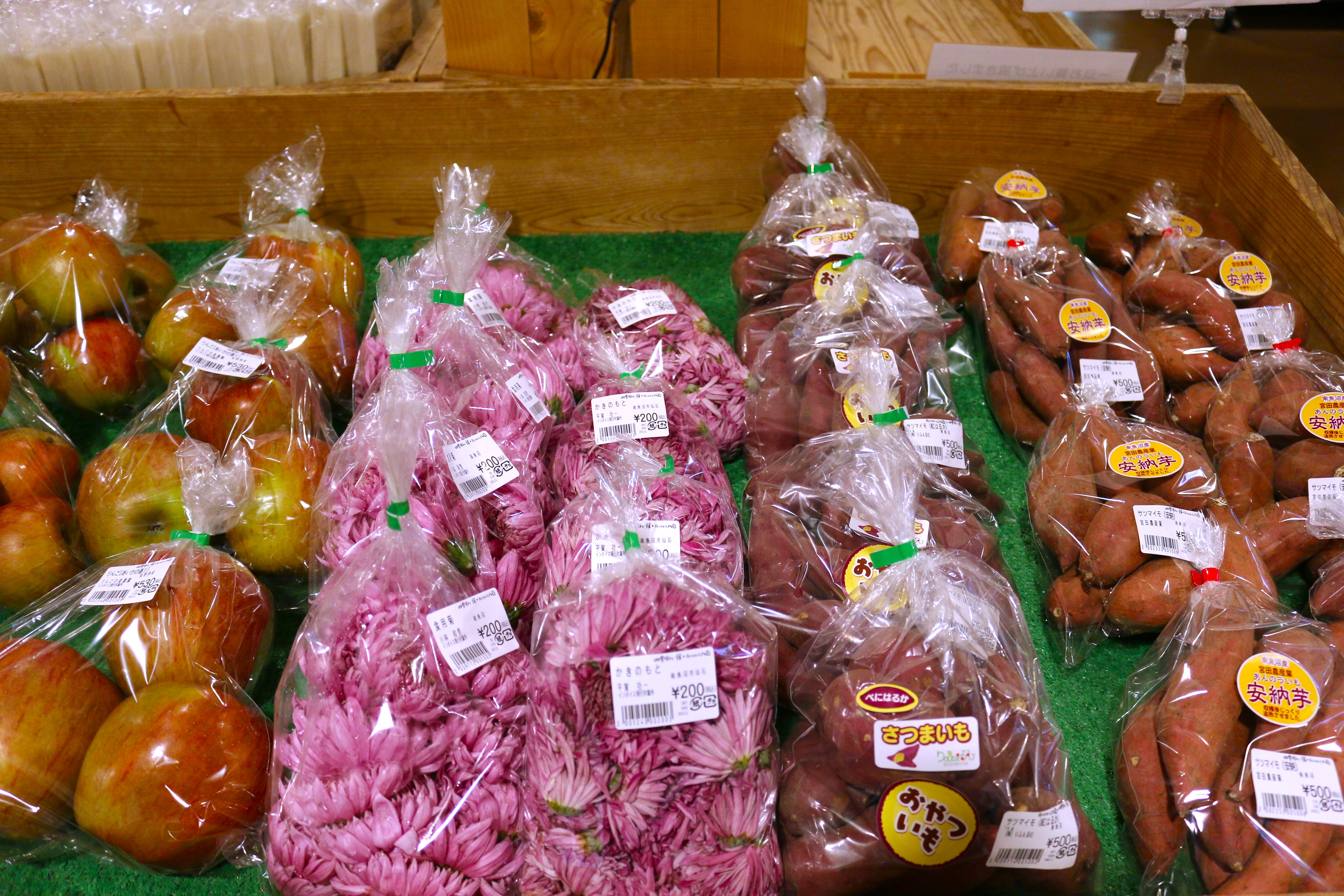 四季味わい館からのお知らせです。本日、河北菜・アスパラ菜・ほうれん草・食用菊の入荷がありました。数に限りがありますのでお早めにご来店ください!